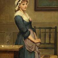 A young woman in a blue dress and white bonnet stands beside a table, looking thoughtfully to the side. On the table are a clear jug, glass, and a few small objects. Behind her is a wooden chair and a framed ship painting.