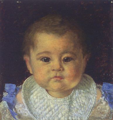 A painted portrait of a baby with short brown hair, large dark eyes, and rosy cheeks, wearing a white bib with lace trim and blue ribbons, set against a dark background.
