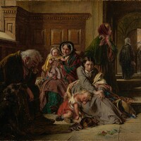 A somber group, including an elderly man, three women, and two children, sits on a courthouse floor. One child clings to his mother.The elderly man holds his head with one hand while people exit through a large door in the background.