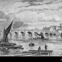 A black and white illustration of boats and people on the River Thames with the old Westminster Bridge and historic buildings, including Westminster Abbey, in the background under a cloudy sky.