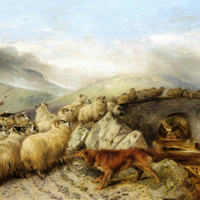 A shepherd and two dogs guide a flock of sheep along a rocky path beside a stone bridge over a stream, with hills and a cloudy sky in the background. Some sheep cross the bridge as others follow behind.