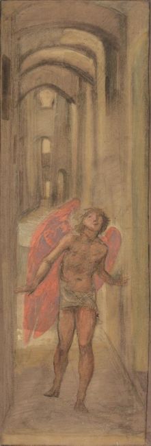 A barefoot, bare-chested angel with red wings and a loincloth stands in a narrow, arched stone hallway, casting a soft shadow, with light streaming in from above.