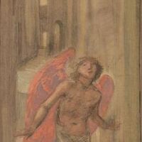 (Water Colour drawing, 1862.) Love as a pilgrim is holding in his right hand an arrow, wherewith he is feeling his way along the street. "Love looks not with the eyes but with the mind, And therefore is winged Cupid painted blind." --Shakespeare.