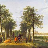 A tree-lined path with people on horseback and on foot, cattle resting, and dogs nearby. On the right, a river flows by a city with buildings and a windmill. The sky is bright with a few birds visible.