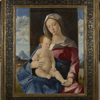 A Renaissance painting in a decorated gold frame shows the Virgin Mary in a blue and red robe, holding the infant Jesus on her lap, with a serene landscape and blue sky in the background.