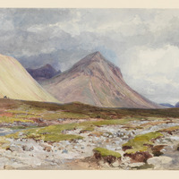 A watercolor landscape painting of rugged mountains under a cloudy sky, with rocky terrain and patches of green grass in the foreground and a winding stream to the left.