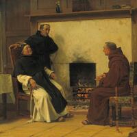 Three monks in brown and black robes sit and stand by a lit fireplace in a cozy, wood-paneled room. One monk is seated and relaxed, another stands beside him, and a third sits opposite, holding prayer beads.