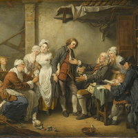A scene of a family gathered indoors, with an older man seated at a table shaking hands with a standing young man, surrounded by women, children, and animals in a rustic, detailed 18th-century room.