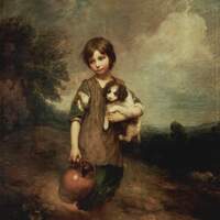 A barefoot child in tattered clothes stands outside, holding a small dog in one arm and a red jug in the other, with a natural landscape and cloudy sky in the background.