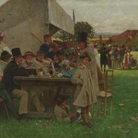 A lively outdoor scene shows people in 19th-century clothing gathered around a long wooden table, eating and chatting. Others stand nearby or walk on a grassy field, with tents and buildings in the background under a bright sky.