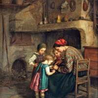 A woman seated by a fireplace helps three young girls, possibly dressing or repairing clothes, in a rustic, old-fashioned kitchen filled with household items and tools.