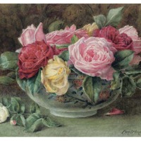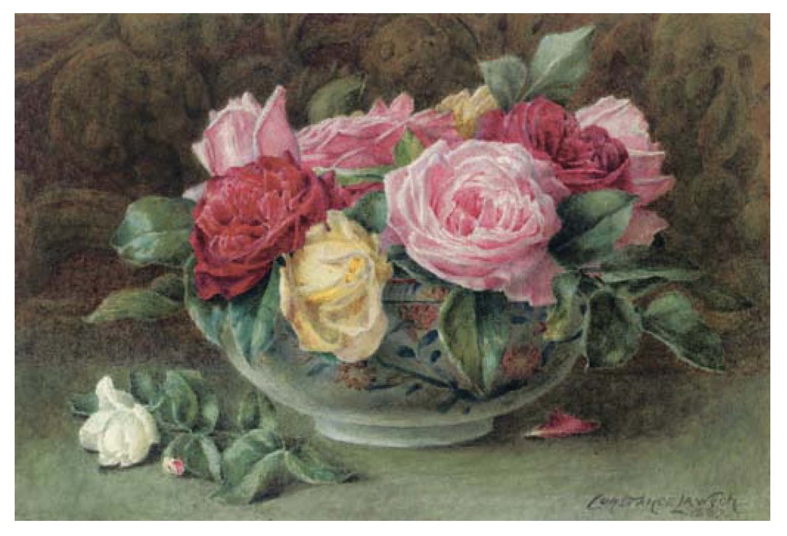 Still Life with a bowl of pink, yellow and red roses