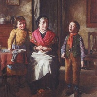 An older woman sits in a chair, smiling, with a young girl beside her and a boy standing and singing in front of her in a cozy, rustic room. The scene feels warm and homely, with simple furniture and soft lighting.