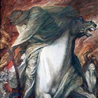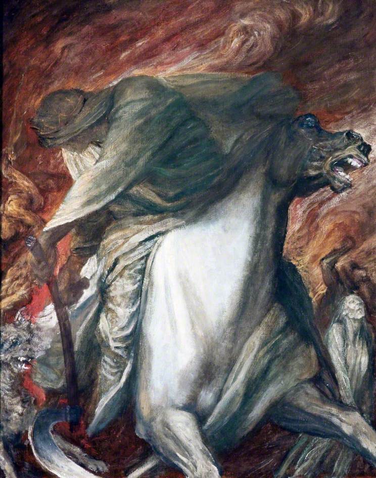 A dramatic painting of a cloaked, skeletal figure wielding a scythe and riding a pale, ghostly horse, with a snarling animal in the background and swirling, fiery clouds overhead.