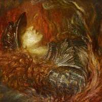 - A painting of a figure in ornate armor and a helmet, lying on their back with closed eyes, surrounded by swirling red, gold, and brown hues suggesting flames or smoke. The atmosphere is dramatic and dreamlike.