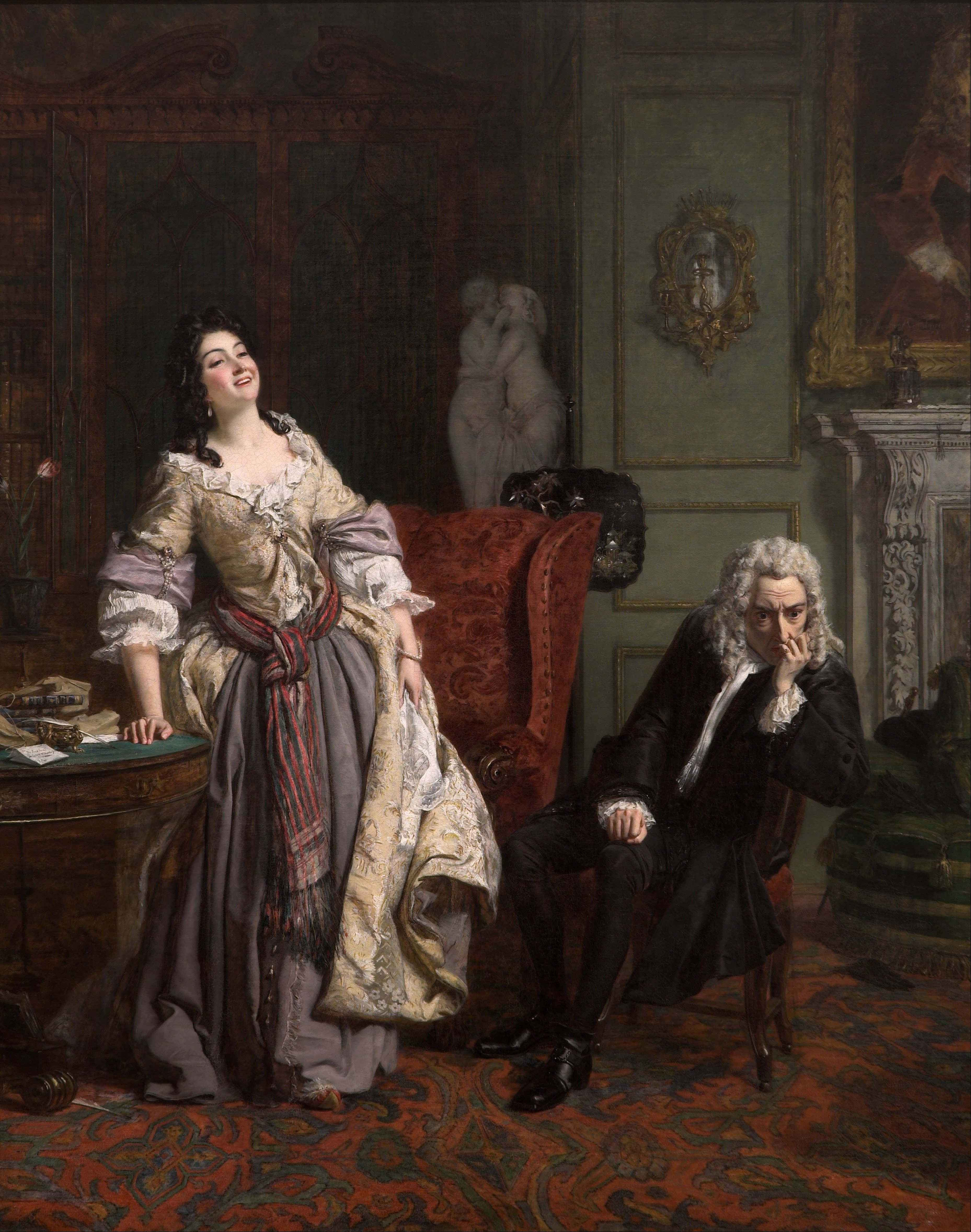 A woman in an elaborate 18th-century dress stands smiling beside a seated, somber man in dark clothing. They are in a richly decorated room with ornate furniture, statues, and paintings.