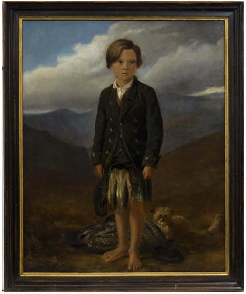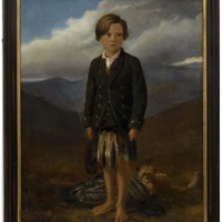 A painted portrait of a young boy in a dark jacket and kilt, holding a hat, standing barefoot on a moor with hills and a cloudy sky in the background. There is a small furry dog and a plaid cloth on the ground behind him.