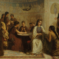 A group of women in classical robes gather in an ornate room. One woman sits at a table, while another kneels before her. Others stand or sit nearby, some holding children, surrounded by intricate wall art and patterns.