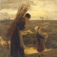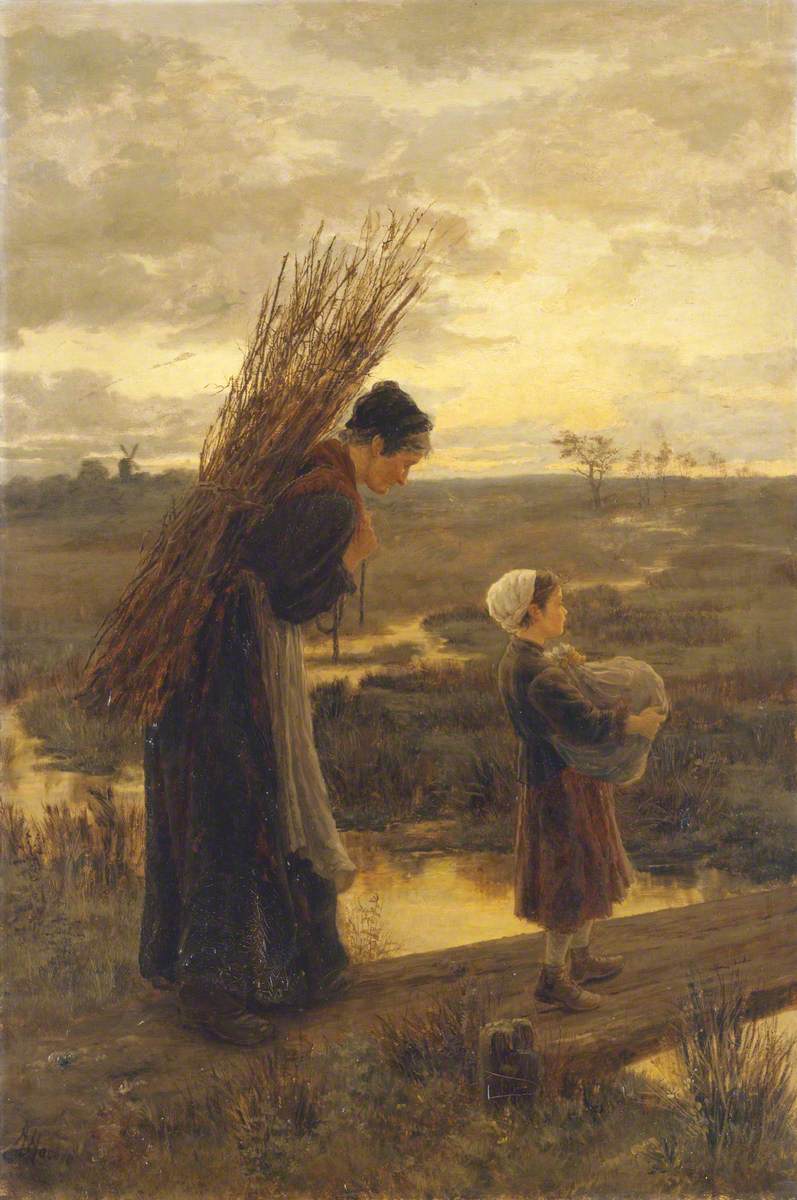 A woman carrying a bundle of sticks on her back walks with a young girl holding a bundle in her arms; they cross a wooden plank over a stream in a flat, open countryside at dusk.