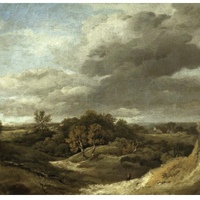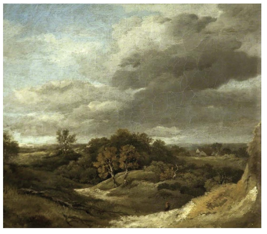 - A moody landscape painting with dramatic, cloudy skies over green hills and scattered trees; a small figure walks along a winding path, and a distant house is partly visible among the trees.