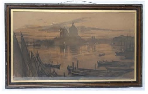 - Framed painting of a calm harbor at sunset, with boats in the foreground and distant buildings with domes and towers reflected on the water, set under a hazy sky.