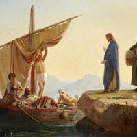A man in blue robes stands on a rocky shore, speaking to three men on a small sailboat, while two others stand nearby holding bundles. Calm water and distant mountains are visible in the background.