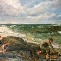 Three children in old-fashioned clothes stand on rocky seaside cliffs with waves crashing behind them under a cloudy sky. One boy pulls a net while the other two children watch from the rocks.