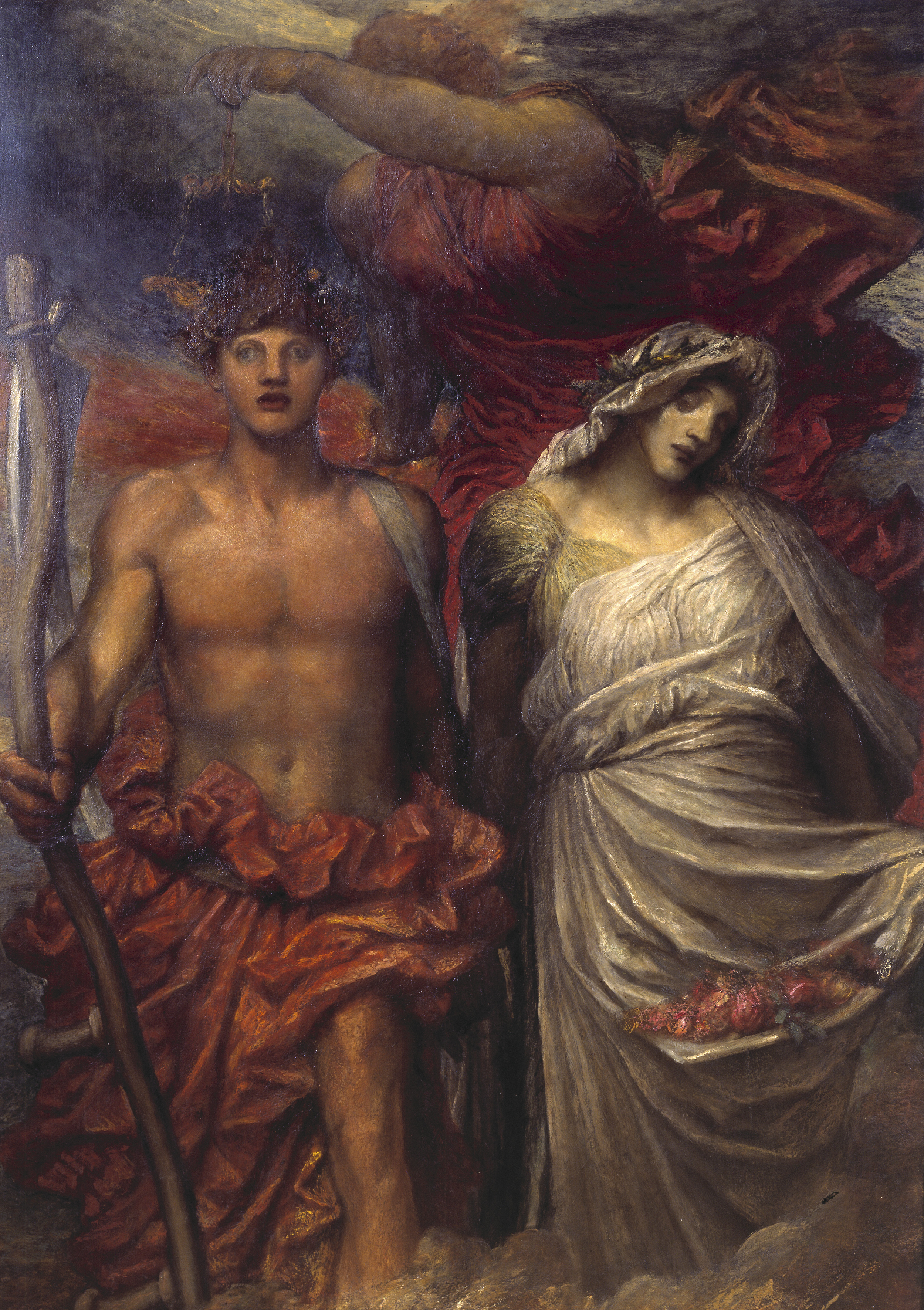 - A painting shows a muscular man in a red drape holding a staff next to a solemn woman in white with flowers, while a large figure in red looms above, placing a crown on the mans head.