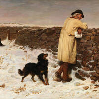 An elderly man in a long coat leans on a stone wall in a snowy field, holding a parcel. A black dog stands nearby, looking up at him, while another dog sits in the distance by a gate.