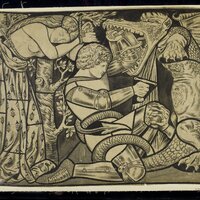 - A knight in armor battles a dragon, stabbing it with a sword. A woman in a patterned dress stands behind him, leaning against a tree, her head resting on her arm as she looks on. The scene is drawn in a detailed, monochrome style.