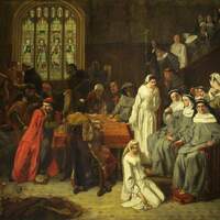 A large group of men and women in medieval clothing gather in a grand hall with stained glass windows, some seated and some standing, as a young woman in white kneels at the center before a table.