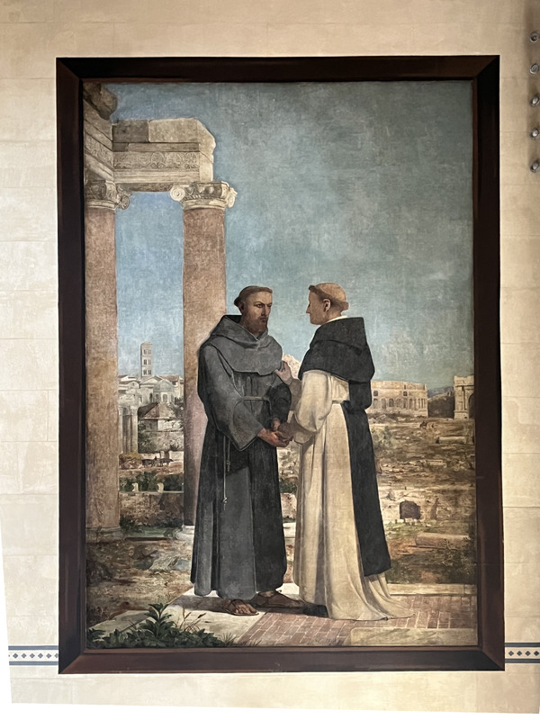 St. Francis and St. Dominic were the two great religious reformers of the thirteenth century--St. Francis, who taught Christian men how they should behave, St. Dominic, who taught them what they should think. Each sent his little company of disciplines, or friars, to teach and preach in all Christian lands, England among the rest; and the memory of the Black Friars of St. Dominic and the Grey Friars of St. Francis survives in the names Blackfriars' bridge and Whitefriars. The artist here shows us the meeting of the two saints amongst the ruins of ancient Rome, the Apostle of Works and the Apostle of Faith shaking hands: "There are diversities of gifts, but it is the same spirit."