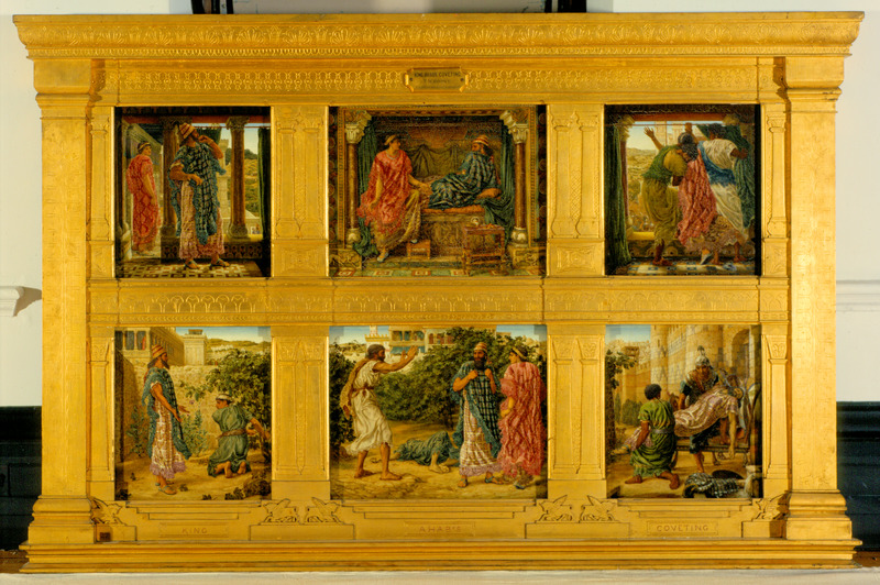 1. King Ahab covets Naboth's vineyard. 2. Naboth refuses to sell it. 3. Jezebel says she can get it. 4. Elijah threatens Ahab with punishment for killing Naboth and taking his land. 5. Ahab brought home dea from battle. 6. Jezebel is being thrown out of the window.