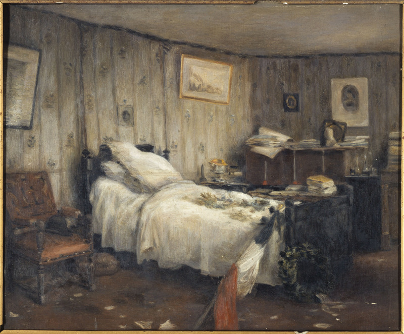 Gambetta died in his villa, near Paris, at midnight, on Tuesday, December 31st, 1882. At the Palais Bourbon, his official residence as President of the Chamber, Gambetta had lived in much splendour, for he believed in the importance of surrounding the highest officers, even of a democracy, with state and maginificence; but this picture shows how small and unpretending was the private house of the greatest man in France. Across the bed is a tri-colour, the national flag of France, in which the body was afterwards wrapped--a fitting shroud for a man who loved his country.