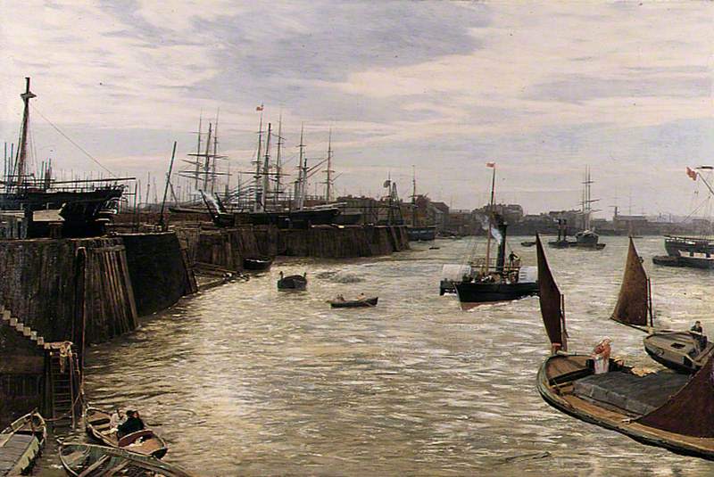 The city rises in a grey mist, behind the shipping. The boats are "outward bound," and beyond / "fair and free / The floodgates are open away to the sea."--(C. Kingsley)