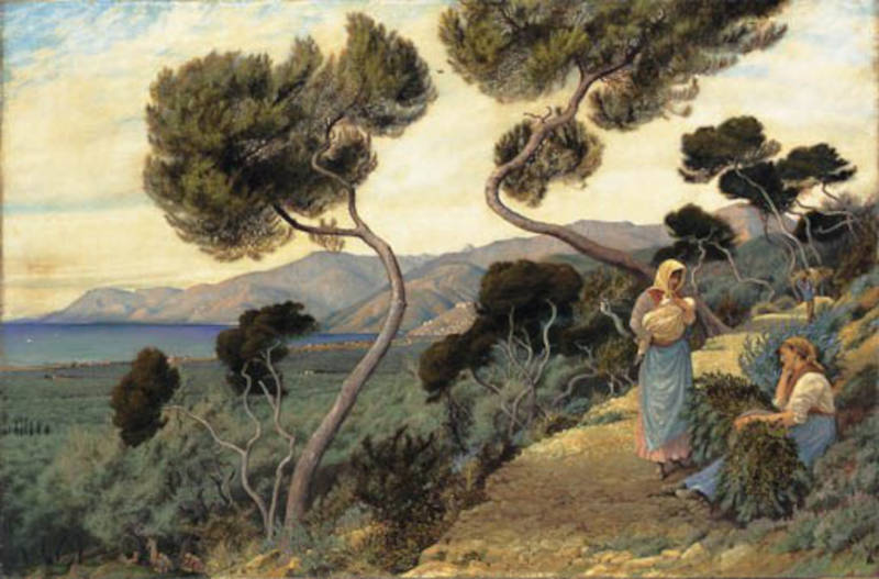 The southern slopes of the maritime Alps are sheltered in winter. The storm-torn pines in the picture make a frame-work through which to look on the olive-clad palins below. The Queen stayed at Mentone two years ago.